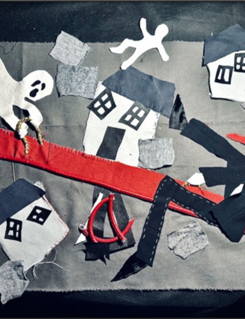 With a dose of (dark) humour, the “sewings” in this collection created by Olivia Dhordhain candidly depict the portrait of a de-humanizing corporate world in which weaponised language loses all meaning. The childlike patchwork, made from work tailor suits and shirts that have been shredded and torn, highlights the contrast between the virtuous rhetoric and a reality shaped by